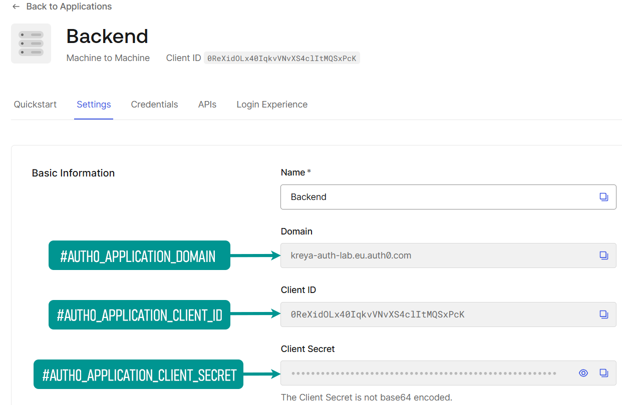 For the Application values, navigate in the Auth0 dashboard to Applications > Applications in the left-hand menu and select the application. This applies to all applications regardless of the type.