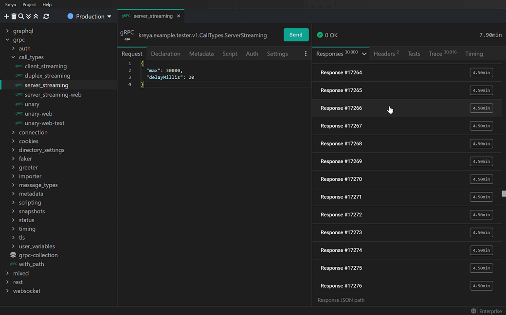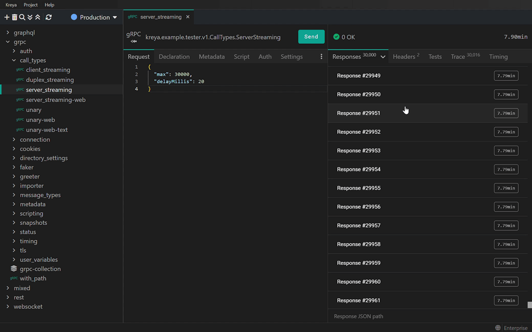 But in other cases, like our response view, we really want to have a list with all available responses. Often, there is only a single response returned by the server. But with gRPC, WebSockets or Server-Sent Events, there is a possibility that many thousands responses will be received and Kreya must handle that use case perfectly.